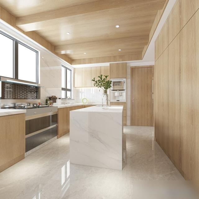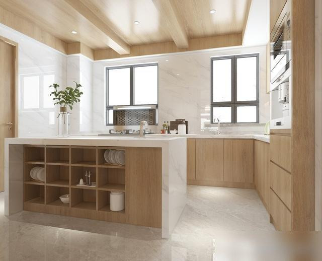 开放式厨房加岛台也贴心,做饭时能和餐厅里的人聊天,不会像封闭厨房那样像“蹲小黑屋”,岛台还能放盆盆罐罐,收纳正好用上,不用把厨房堆得乱七八糟。