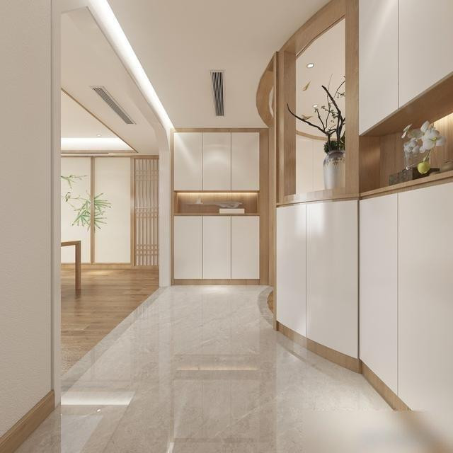 用圆形餐厅当过渡太聪明了——既挡住了进门的视线,又掏出了鞋柜位置,大理石地面一铺,开门就有仪式感,白色无拉手柜门看着干净,拿鞋也不用抠拉手,细节里全是方便。