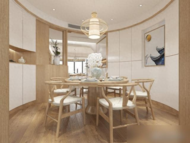 圆形餐厅真的有灵气,墙面白加原木加一点蓝,活泼又不杂乱,顶上星星射灯一开,吃饭都有氛围——以前觉得餐厅只要能摆桌子就行,现在才懂,好看的餐厅能让一家人更爱坐下来吃饭。