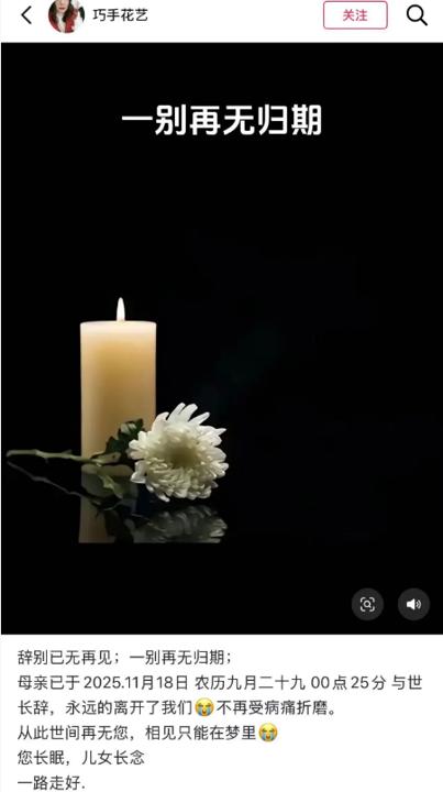 近日,湖北一博主“巧手花艺”患癌去世,其女儿用母亲账号发布一则动态,悼念母亲于18日凌晨去世,年仅44岁。